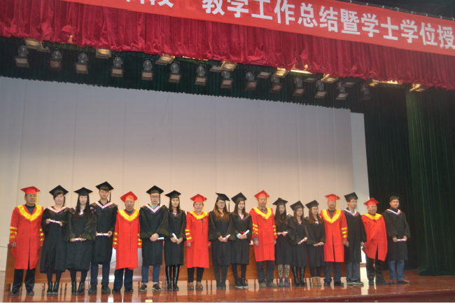 12月12日下午2点半,学校2014年度“本科段”教学工作总结暨学士学位授予仪式在500人报告厅隆重举行。人文艺术与法律学院71位12专接本班毕业生与教师代表参加了此次仪式。