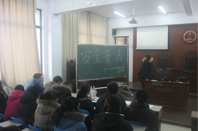 为加强宿舍管理,进一步增强全体学生法制安全意识,全力普及法制安全知识,12月25日下午4点半,人文艺术与法律学院自管会在S3模拟法庭召开了“五进公寓”系列活动之安全普法专题讲座,我院大一各班学生代表听取了本次讲座。