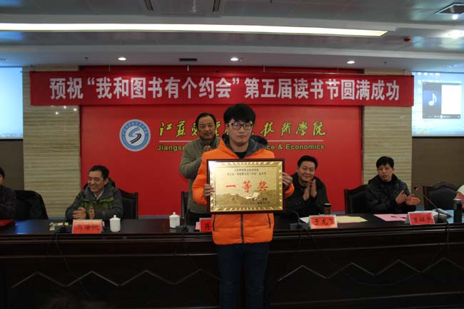 “大学之道,在明明德,在亲民,在止于至善……”伴随着激昂的音乐,慷慨有力的诗朗诵《读书赋》一字一句回荡在图书馆二楼第一会议室,原来,这不是诗词朗诵会,而是由图书馆、团委、读者协会联合举办的第五届“我和图书有个约会”读书节闭幕式的现场,学校副校长蒋超五、图书馆全体人员、团委领导、各院系团总支书记、读书节获奖个人和团体以及读者协会共100多人参加了闭幕式及表彰大会。