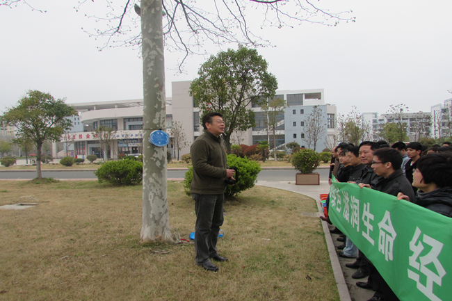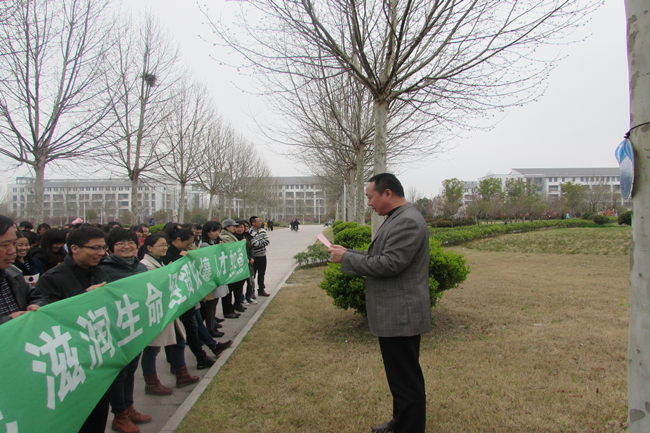 绿色使我们的校园更加美丽,“呵护绿色,滋润生命”是我们每个人应尽的义务和不可推卸的责任。学院院长笪建军向全体师生提出了几点建议:一是树立绿色文明观念,自觉关心生活环境状况,遵守环境保护法律法规,把个人环保行为视为个人文明修养的组成部分。二是爱护校园绿化,立即行动起来,集体关心支持和积极参与校园绿化建设和管理,爱护花草树木设施,对破坏绿化设施的行为要敢于制止并举报。三是养成良好的卫生习惯,不随意乱扔瓜皮果壳、烟头、食品包装物等,不随地吐痰。请伸出你的手,捡起地上的一张废纸、一只废塑料袋、一个烟蒂,为校园的整洁献出你的爱心。同学们认真聆听着笪院长的建议,更加坚定了保护环境、美化校园的决心。