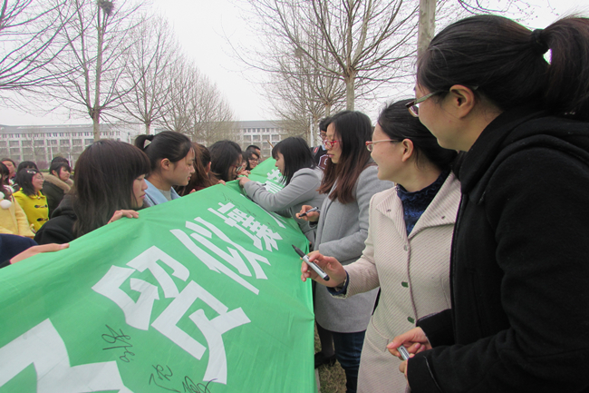师生在横幅上签字留念