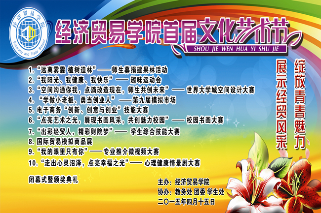 四月,大地回春,百花齐放;四月,朝气蓬勃,激情飞扬;在这个充满青春活力的四月里,经济贸易学院首届文化艺术节向我们走来,四月,我们在经贸,你在哪?