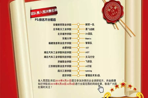 本次大赛由国家工业和信息化部主办,教育部指导,鼎捷软件股份有限公司承办,预赛时间为2015年3月10日至4月25日,全国共有96支代表队参加预赛,大赛选拔出10支代表队参加决赛。我校工商管理学院黄硕、孙青青、孙悦三位同学组成的代表队,在该院院长田青、周爱群老师的精心指导下,认真准备,经过45天的紧张训练,成功晋级决赛。