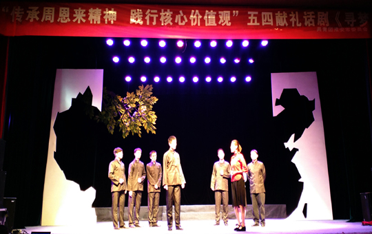 由共青团淮安市委主办,淮安戏剧人剧社指导,我校话剧社团孙天宝、章婧伊等同学领衔主演的话剧《少年周恩来之寻梦》今年五四期间在江苏省淮海剧团荷芳剧院成功公演。淮安市文广新局局长杨斌、淮安日报社党委副书记周凌、周恩来纪念地管理局副局长张凌云、团市委副书记李义翠、我校团委书记朱绍勇与200余名观众一起观看了首次公演。