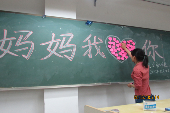 活动开始,以小组讨论的方式来谈谈20年来母亲对我们的默默付出,明白母亲在我们成长路上所做的付出与牺牲。很多同学沉浸在回忆当中,用心体会这些年的母亲的不易与艰辛。秘书处干事们给每人发张便利贴,并在纸上写下平时不好意思或难于开口对母亲说的话,告诉她,我们爱她。写完后粘贴在黑板中央的爱心里,同时献上深深的祝福,献上我们一颗“感恩的心”,轻轻地对 妈妈说一声:母亲节快乐!在牢记父母的养育之恩的同时学会感恩,学会回报身边的人,回报那些帮助过自己的人,同时帮助需要帮助的人。