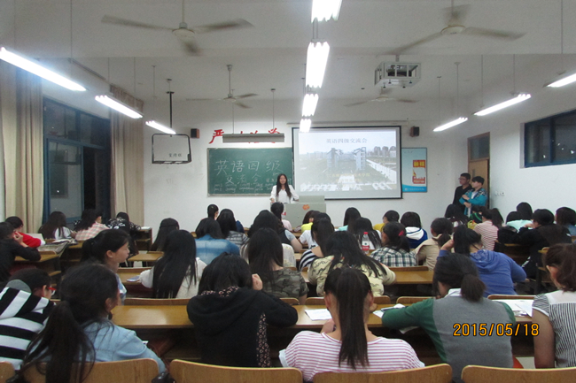 为了进一步加深学生对英语四六级的认识,增强大家成功过四级的信心。5月18日晚上7:00,我院学生部在JB101举办了“营造良好英语学习氛围,备战英语四级考试”经验交流会,我院大二英语四六级考试成绩突出者代表和50多名学生参加了本次交流会。