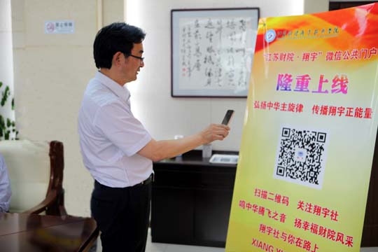 师生结对仪式后,杜校长简单介绍了我校翔宇社及“江苏财院·翔宇”微信平台建设情况;程校长扫描“江苏财院·翔宇”二维码,推送发刊词,正式启动微信教学平台。