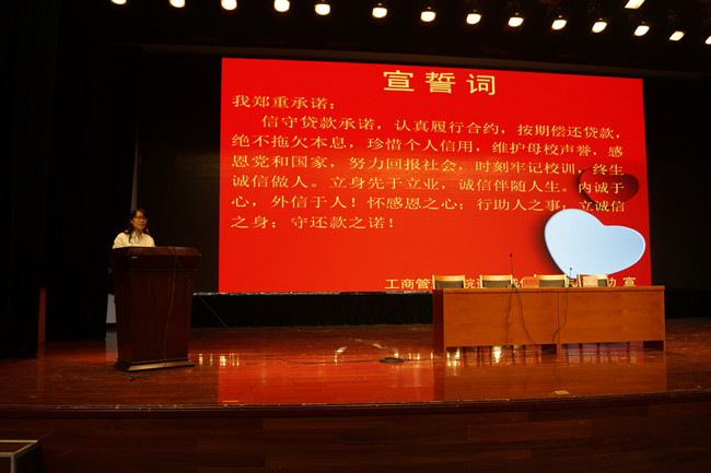 活动中,学院负责资助教育工作的徐静老师要求所有2015届贷款毕业生贷款同学签订了《国家开发银行国家助学贷款毕业确认表》及《国家助学贷款学生还款诚信承诺书》,重申和强调提前还款流程和贷款违约的后果及其严重性,对贷款毕业生提出的疑问一一作出解答,并带领大家进行了宣誓,表达了他们要诚信守信、按时还款的坚定信念。