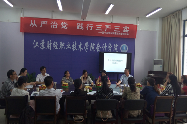 座谈会前会计学院组织外聘教师一起学习了新的《江苏财经职业技术学院工作量计算办法》。(会计学院供稿)