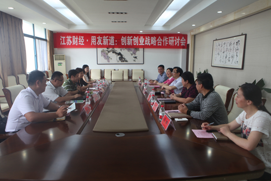2015年6月25日,我校与用友新道公司在行政楼310会议室举办创新创业战略研讨会。用友新道支持部总经理宋国荣、方案支持专业员郭叶峰、孙琢,江苏分公司总经理宋清、业务经理崔小舟,以及我校校长程淮中,副校长杜萍,教务处、学生处、校企合作办负责人参加本次研讨会。