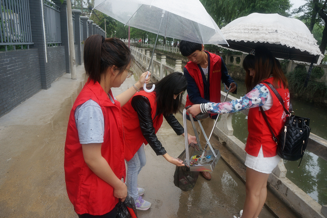 下午两点,在约定了结束后的集合地点之后,大家开始分头行动,前往各个大街小巷,寻找着地上的垃圾。烟头、塑料袋、卫生纸、烟盒等等各式各样的垃圾不断增加着大家手中垃圾袋的体积。虽然下着小雨,但是同学们每个人都尽心尽力,引来了当地居民的询问后的由衷赞美之情。尽管感到了一丝疲乏,尽管与泥水搅混在一起的垃圾有些让人不适,但终归还是为当地民众做了一点事,志愿者们都感到了由衷的快乐。在高书记的讲述下,我们得知社区的一条小路是通往社区小学的必经之路,小朋友们吃余下的果皮,用剩下的纸屑经常给社区的环卫阿姨带来一定的困扰,志愿着们集思广益,在小路上的显眼位置设置了环保标语,并当机立断搬来了垃圾箱放在了小路的一旁,期望开学后,小朋友们能够看到志愿者们的成果,给环卫工人减轻一点负担。