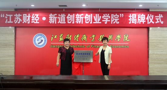 △北京用友新道科技有限公司副总裁周前进与我校党委书记韩香云为“江苏财院•用友新道创新创业学院”揭牌