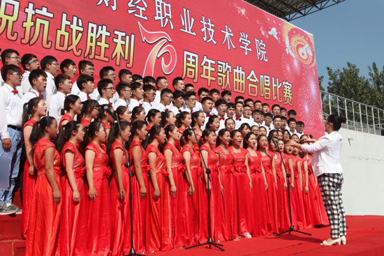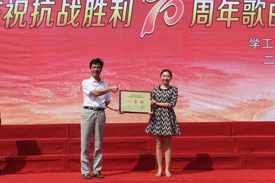 9月16日上午,由校学工部、人武部、团委主办的“纪念抗日战争胜利70周年歌曲合唱比赛”在东操场隆重举行。学校副校长张春,学工部、人武部部长刘其生,团委书记朱绍勇出席观看比赛并分别为获得一、二、三等奖的院(系)颁奖,到现场观摩比赛的还有各二级院(系)党总支书记、班主任和辅导员老师。