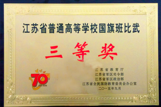 9月25日,为庆祝抗日战争暨世界反法西斯战争胜利70周年、大学生军训试点工作30周年,由江苏省教育厅、江苏省军区司令部、江苏省军区政治部、江苏省全民国防教育委员会办公室联合主办的江苏省高校国旗班比武表彰大会在中国药科大学江宁校区隆重举行,我校获得全省普通高校国旗班比武三等奖。