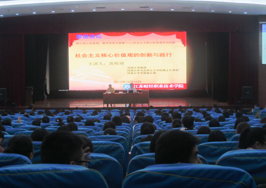 黄明理教授是国内知名的马克思主义理论及伦理学研究专家,还担任江苏省伦理学会副会长、江苏省公民道德发展与人的现代化研究基地首席专家、博士生导师、河海大学学报副主编等职务。报告中,黄教授从社会主义核心价值体系(观)提出的国内国际背景、社会主义核心价值体系(观)的主要内容及创新、社会主义核心价值观及其面临的质疑、核心价值观:敬业与友善等四个方面展开。通过透彻地理论讲解和现实联系,指出了确立社会主义核心价值观的必要性和紧迫性,阐明了社会主义核心价值观的科学内涵,解答了对社会主义核心价值观常见的一些误解和偏见,同时还重点结合大学生的实际,论述了核心价值观中的两个重要内容:诚信和友善。整场报告精彩纷呈,黄教授以深厚的理论底蕴、幽默通俗的语言、广博丰富的见闻征服了大家,一个多小时的报告会数次被热烈的掌声打断。报告会结束后,仍有很多同学余犹未尽,纷纷走上讲台向黄教授请教自己的一些问题。