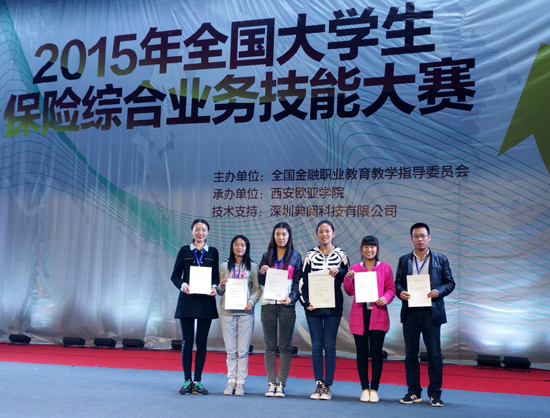 本次大赛由全国金融职业教育教学指导委员会主办,西安欧亚学院承办,是目前国内级别最高的大学生保险综合业务技能竞赛。我校系首次参加保险类竞赛,得到了学校领导的高度重视。赛前,金融学院从14金融保险班学生中挑选4名同学,由曾磊、朱江两位老师精心指导组队,师生共同努力,利用周末、晚间、假期等进行高强度训练,最终同来自全国高职院校的共40支代表队,160名参赛选手同台竞技。