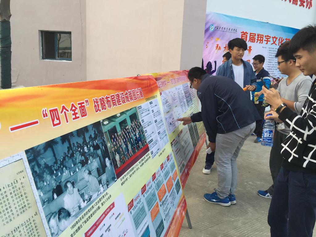在校内展览期间,许多同学利用饭前和饭后的时间,快速浏览展板上的内容,虽然看上去不够仔细,但是他们多少有些收获,正如一位同学所言:“我终于知道‘四个全面’是什么意思了。”有的老师和同学看的很认真,还会彼此讨论一番,称赞展板的内容丰富,关键点突出。