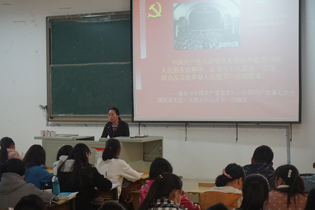 首先李书记为我们讲了党的宗旨的确立,为我们介绍了《中国共产党章程》的主要内容,列举了几位优秀党员和他们的伟绩,新时代的党领导人物。学员们在李书记的带领下重温了中国共产党的成立和发展历程。随后,李书记给同学们阐述了新时代党的宗旨和内涵,并讲述了现在领导人走群众路线的重要性,告诉同学们作为一名合格的党员要把党的利益放在第一位,李书记用自身经历告诉我们在大学时代要有自己的价值观,和实现目标的重要性。最后,李书记号召全体学员认真学习,汲取智慧,增强社会责任感与使命感,坚定共产主义信念,提高综合素质,为我们中国梦的早日实现贡献自己的一份力量。