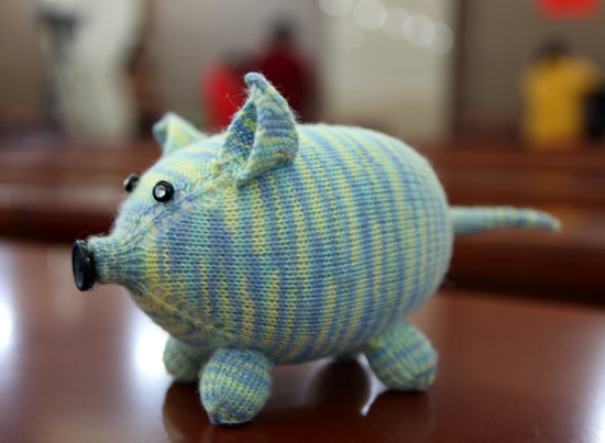 会议桌变成了临时的陈列展示台,惟妙惟肖的乌龟、憨态可掬的小猪、精致漂亮的毛衣、花色款式多样的围巾、五颜六色的杯垫、拖鞋、背包等毛线编织品在“展台上”整齐地摆放着,大家都纷纷拿起手机,拍着眼前的精美作品。许多女教师现场展示了曾经为子女编织的毛衣、袜子和围巾等毛线编织品,一件件代表母爱的衣帽鞋袜,甜蜜又温暖。