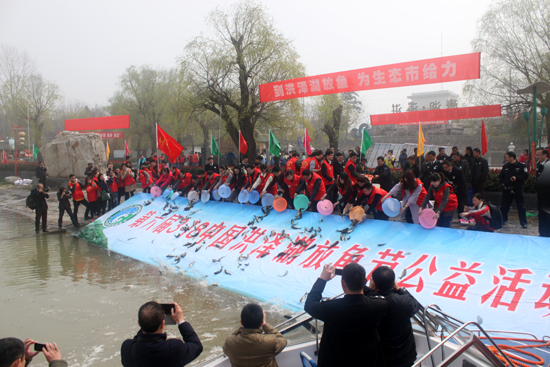 到洪泽湖放鱼,为生态市给力。3月18日上午,春雨滋润后的洪泽湖景色迷人,热闹非凡。第六届中国·洪泽湖放鱼节公益活动在洪泽县渔人湾码头举行。活动由江苏省海洋与渔业局、淮安市人民政府共同主办。省海洋与渔业局副局长林建华,淮安市人民政府副市长赵洪权等领导出席启动仪式。接组委会和共青团淮安市委青农部的邀请,校团委“绿色家园”环保协会、会计学院分团委组织60余名环保志愿者服务本次公益活动。