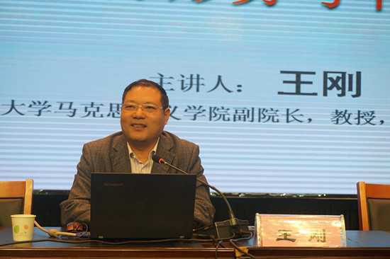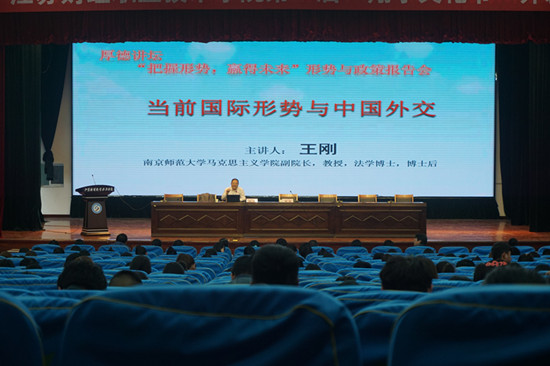 5月10日下午,南京师范大学马克思主义学院副院长王刚教授应邀来我校为师生们作了题为“当前国际形势与我国外交”的形势与政策报告,报告会在图书馆二楼多功能报告厅举行,思政部全体教师和来自15级12个班级的同学现场聆听了报告,思政部主任邹瑄主持报告会。