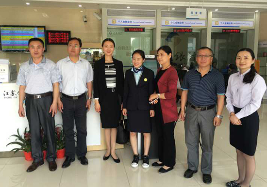 为了解学生在企业的实习情况,加强校企双方的交流,5月12日,金融学院院长李丞北、副院长苏启立和顶岗实习指导老师曾磊与江苏银行淮安分行零售部总经理张劲松、零售部总经理助理叶玉霞,共同走访了江苏银行淮安分行的相关营业网点,探望顶岗实习学生,实地调研与解决学生顶岗实习中遇到的实际问题。