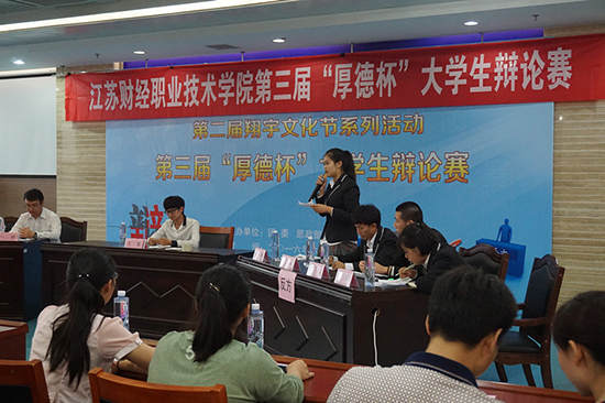 经过四周的鏖战,第三届“厚德杯”大学生辩论赛终于进入尾声,6月21日下午,冠亚军决赛和季军争夺赛在图书馆第一会议室隆重上演,质量监控与督导办公室主任郭德怀、教务处处长王丹、思政部主任邹瑄、宣传部部长助理桑雷、团委副书记费婷婷等领导担任评委,来自全校100余名学生代表观摩了比赛,金融学院的薛健同学担任辩论赛主持。