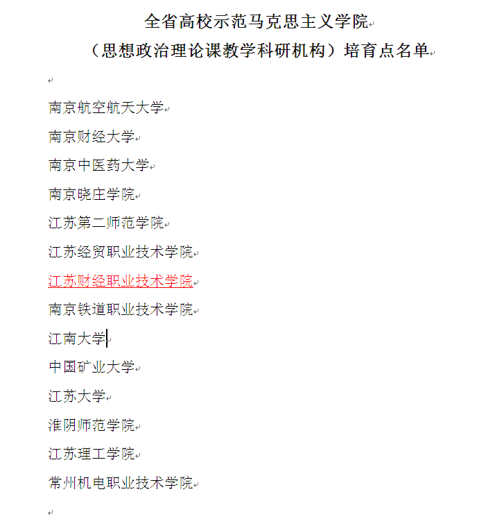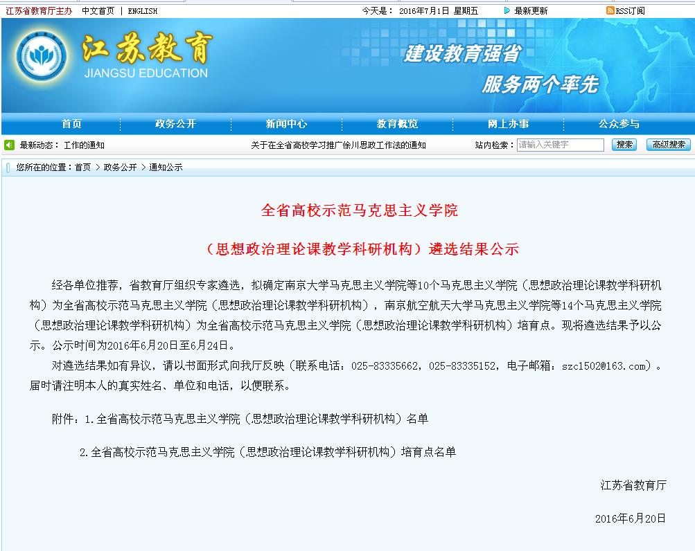 2016年6月27日江苏省教育厅发文(﹝2016﹞213号),对全省高校示范马克思主义学院(思想政治理论课教学科研机构)遴选结果进行了正式公布。南京大学、东南大学等10所本科院校被确定为全省高校示范马克思主义学院(思想政治理论课教学科研机构),包括我校在内的14所本专科院校被确定为全省高校示范马克思主义学院(思想政治理论课教学科研机构)培育点。