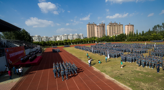 会操结束后,全场师生起立,用热烈持久的掌声欢送承训部队教官离场。