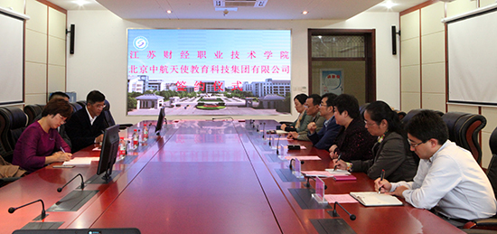 10月19日下午,江苏财经职业技术学院与北京中航天使教育科技集团有限公司校企联合办学签约仪式在图书馆第二会议室举行。北京中航天使教育科技集团有限公司董事长宋岩、副总经理李天宇、教学部部长谢月华一行3人出席了签约仪式。校长程淮中,副校长杜萍,教务处处长王丹,人文法律与艺术学院党总支书记陈国强、院长张晓红、教研室主任杨智均出席了此次活动。签约仪式由副校长杜萍教授主持。