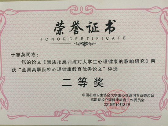 10月20日到22日,由中国心理卫生协会大学生心理咨询专业委员会高职院校心理健康教育工作委员会,主办的“2016年全国高职院校心理健康教育学术年会”,在山东青岛职业技术学院隆重举行。我校于志英老师的《素质拓展训练对大学生心理健康影响研究》喜获优秀论文二等奖。本次大会优秀论文从众多申报论文中,通过专家评审和网上公示,最终评出一等奖8篇,二等奖17篇,三等奖33篇。