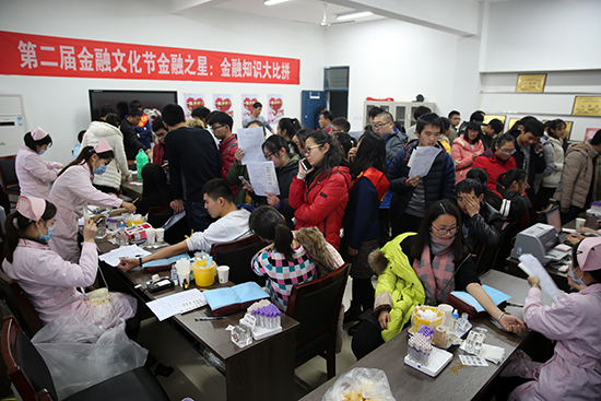 “听说O型血的人被称为‘全能捐赠者’,恰巧我是O型血,所以就过来献血了。”虽然天空下着雨,但丝毫没有影响到我校各院系学生无偿献血的热情。纷纷聚集到笃行楼参加活动。在淮安市中心血站的安排下,体检、验血、献血等环节都在有序的进行。前来献血的同学拿着填好的表单等待着。“以前打针都是往后躲,今天却迫切的希望针能先扎我。”很多同学都是第一次献血,通过交流,小记者了解到,那些自愿献血的同学都是想为社会奉献一下自己绵薄之力,所以大家都显得比较兴奋,场面也相当热闹。