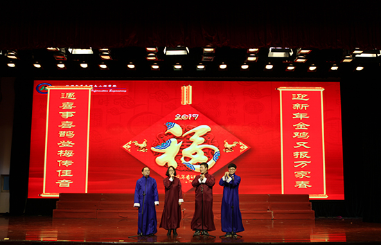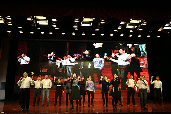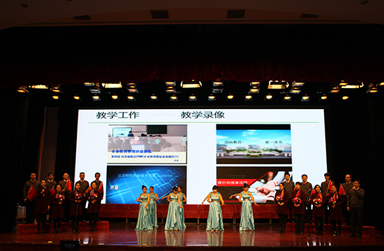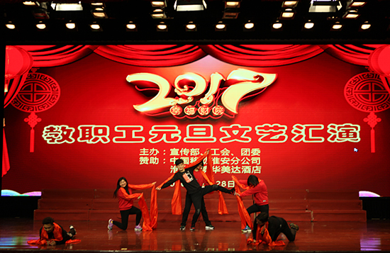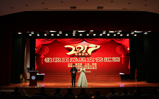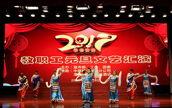 12月28日下午,学校2017年元旦教职工文艺汇演欢乐开幕。学校党委书记韩香云,校长程淮中教授,党委副书记刘芳,副校长蒋超五、戴光顺、杜萍、张春与教职员工一起观看了演出。