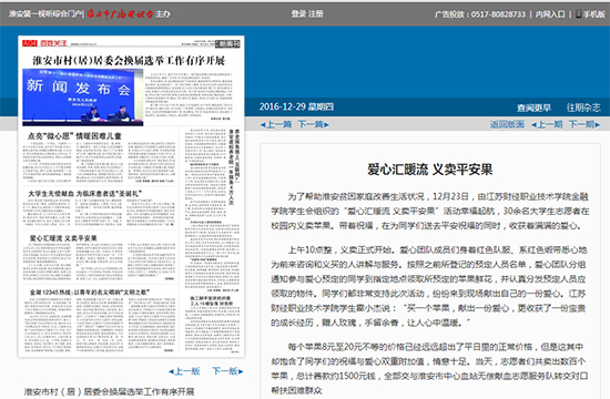 为了帮助淮安贫困家庭改善生活状况,12月23日,由江苏财经职业技术学院金融学院学生会组织的“爱心汇暖流 义卖平安果”活动幸福起航,30余名大学生志愿者在校园内义卖苹果。带着祝福,在为同学们送去平安祝福的同时,收获着满满的爱心。