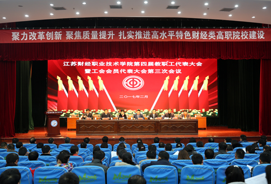 最后,党委书记韩香云在会上作了重要讲话。韩书记指出,“十三五”时期,是学校“创优进位、提质赶超”的重要战略机遇期,是着力建设“质量高、特色显、环境优、师生幸福感强的新财院”的关键时期。做好今年的各项工作,特别是全面做好江苏省优质高等职业院校创建的各项工作,对于促进学校上台阶、上水平,顺利完成“十三五”发展目标具有至关重要的意义。为此,韩书记代表学校党委提出三点要求:一是聚力改革创新,努力在办学水平高上作出更大贡献;二是聚焦质量提升,努力在办学特色上取得更大成效;三是强化民主管理,努力在实现“财院梦”上发挥更大作用。韩书记强调,全校上下要认真贯彻落实学校2017年两会精神,始终沿着“十三五”规划的行动路线,进一步解放思想,坚定信心,开拓进取,扎实工作,为“全面建成高水平特色财经类高职院校”做出新的更大的贡献,以优异的成绩迎接党的十九大胜利召开。