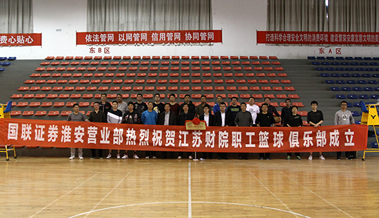4月12日下午,我校“教职工篮球俱乐部”成立揭牌仪式在训练馆举行。国联证券淮安营业部陈总与我校副校长张春共同为俱乐部成立揭牌,学校工会主席袁丹,篮球俱乐部成员参加揭牌仪式并合影留念。
