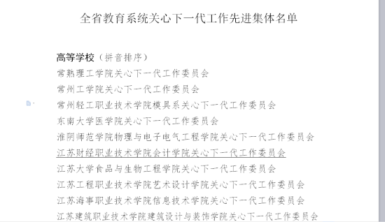 (通讯员 刘其生报道)近日,江苏省教育系统关心下一代工作委员会发布《关于表彰全省教育系统关心下一代工作先进集体、先进个人的决定》(苏教关委【2017】13号),我校会计学院关工委荣获先进集体。这是我校各学院二级关工委自成立以来第一次获此殊荣,标志着我校各学院二级关工委各项工作已经进入全省教育系统,特别是高校关工委工作的先进行列。