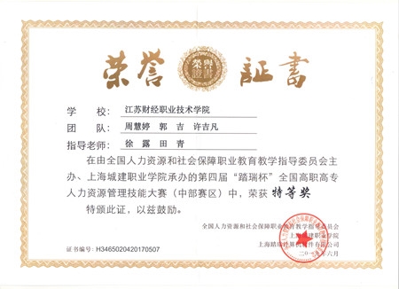 6月1日,由全国人力资源和社会保障职业教育教学指导委员会主办的2019年第四届全国高职高专人力资源管理技能大赛(中部赛区)在上海城建职业学院落下帷幕。由我校工商管理学院周慧婷、郭吉、许吉凡三位同学组成的江苏财经代表队荣获本次大赛特等奖,两名指导教师工商管理学院工商企业管理教研室徐露主任、金融学院院长田青教授荣获优秀指导老师奖。