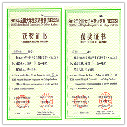 近日,2019年全国大学生英语竞赛结果公布,我校朱桂平老师指导的18财管(淮师)班的周静怡,张孟琳老师指导的16会计(南审)班的冯帆同学分别获得本届全国大学生竞赛(D类)一等奖。