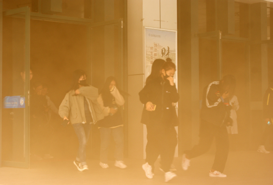 下午2:00,在烟幕弹的作用下,图书馆走道内很快就充满了浓烟,同学们在引导员的引导下用湿毛巾等掩住口鼻迅速跑出图书馆,同时消防员打开消防水带向图书馆洒水稀释烟雾,以便学生更顺利的进行疏散。