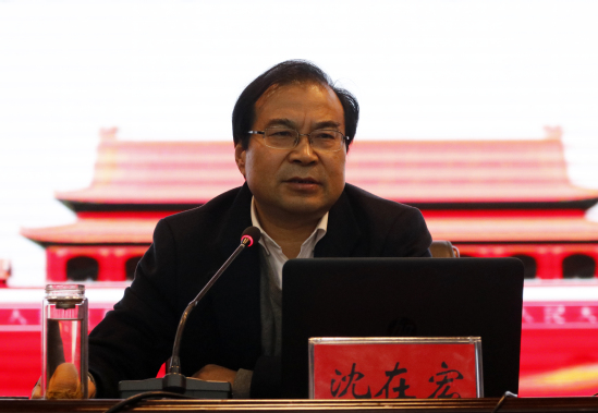 会上,沈在宏以《开辟“中国之治”新境界 深刻领会党的十九届四中全会精神》为题,从党的十九届四中全会概况,习近平总书记关于《中共中央关于坚持和完善中国特色社会主义制度、推进国家治理体系和治理能力现代化若干重大问题的决定》的说明,深刻把握《决定》的重大现实意义和深远历史意义,党的十九届四中全会内容重点解读,加强党的领导、确保全会确定的各项目标任务全面落实到位等五个方面,紧密联系当前国际国内形势、联系新中国成立70周年取得的辉煌成就、联系党员干部的思想和工作实际,多角度多方面对全会精神作了全面准确、深入系统的阐释。