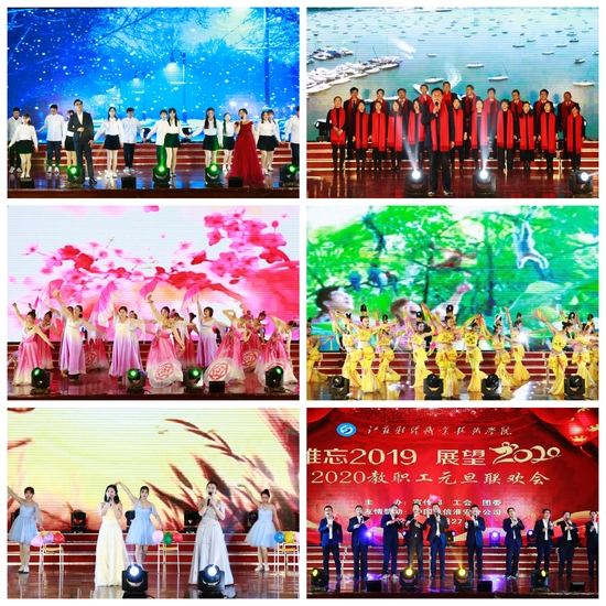人文艺术与法律学院分工会的歌伴舞《大中国》、图书馆分工会的合唱《东方之珠》、粮食工程与食品药品学院分工会的歌伴舞《TAKE ME TO YOUR HEART》、工商管理学院分工会的合唱《我的中国心》、金融学院分工会的歌舞《强国一代有我在》、经济贸易学院分工会的歌伴舞《茉莉花》、会计学院分工会的合唱伴舞《月光》、马克思主义学院分工会的歌伴舞《风吹麦浪》、机械电子与信息工程学院分工会的歌曲《恐高的鸟》、基础教学部分工会的排舞《舞动中国》,师生同台,载歌载舞,给现场观众带来了丰富的视听盛宴,一起在多彩的歌舞中迎接新的一年。