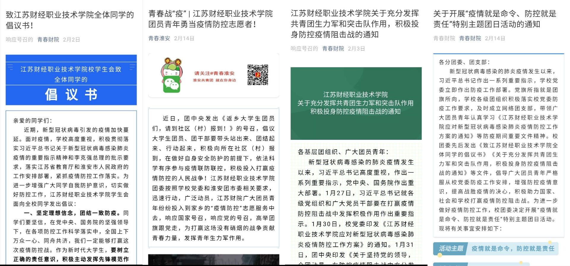 学院团委依托“青春财院”微信平台、“江苏财经职业技术学院团委”微博平台以及“青春财院”抖音等新媒体阵地,制作发布相关推文45篇,短视频16个,在疫情防控的特殊时期,坚决管好媒体阵地,把握线上教育,坚持团结鼓劲、正面向上导向。新媒体中心制作战“疫”系列推送,打造温暖财院品牌,坚持强信心、暖人心,激发出、凝聚起打赢防控阻击战的强大精神力量;推出“假期修炼手册”,推荐精品书单、影视作品、公众号与技能学习网站,引导学生“停课不停学”,充实度过居家学习生活;发布抗“疫”征集令,鼓励学生以微视频拍摄、艺术创作等方式讲述战“疫”故事,提高舆论引导实效。学生党员李林等12位学生干部发出先锋之声,号召广大青年以先进精神砥砺自我、塑造人格;邀请冯辉老师分享在线教学经历,开展“KIP”打卡学习活动,助力线上教学,确保教学质量;团市委官微发布《青春战疫|江苏财经职业技术学院团员青年勇当疫情防控志愿者!》新闻报道,总结宣传我校青年在疫情防控斗争中涌现出的先进典型和事迹,凝聚强大正能量。