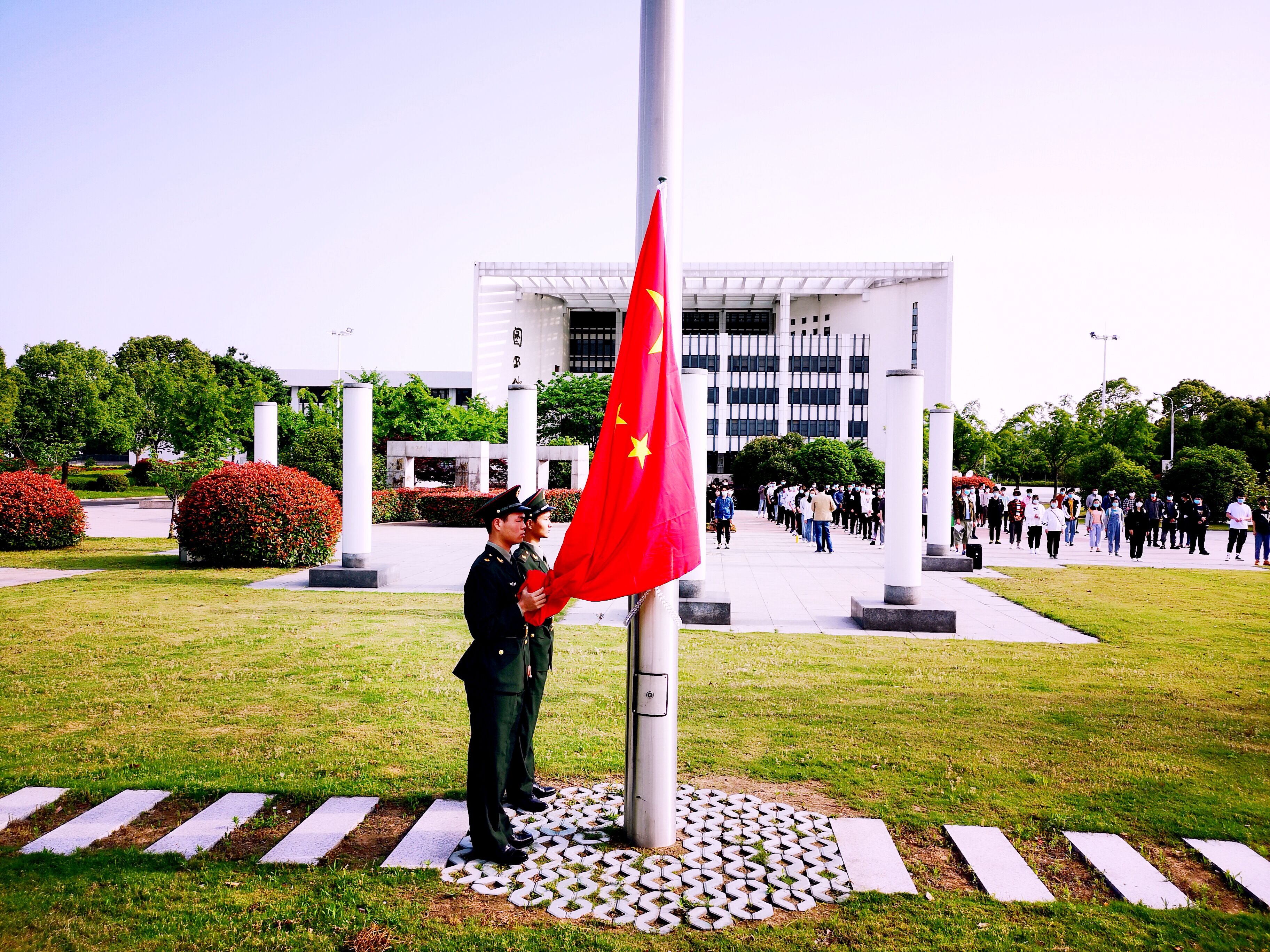 5月18日清晨,7点40分随着雄壮激昂的《义勇军进行曲》奏响,鲜艳的五星红旗缓缓升起,徐徐展开,在全场人员的注目中,国旗迎着初升的太阳,迎风飘扬在江苏财经职业技术学院的上空。