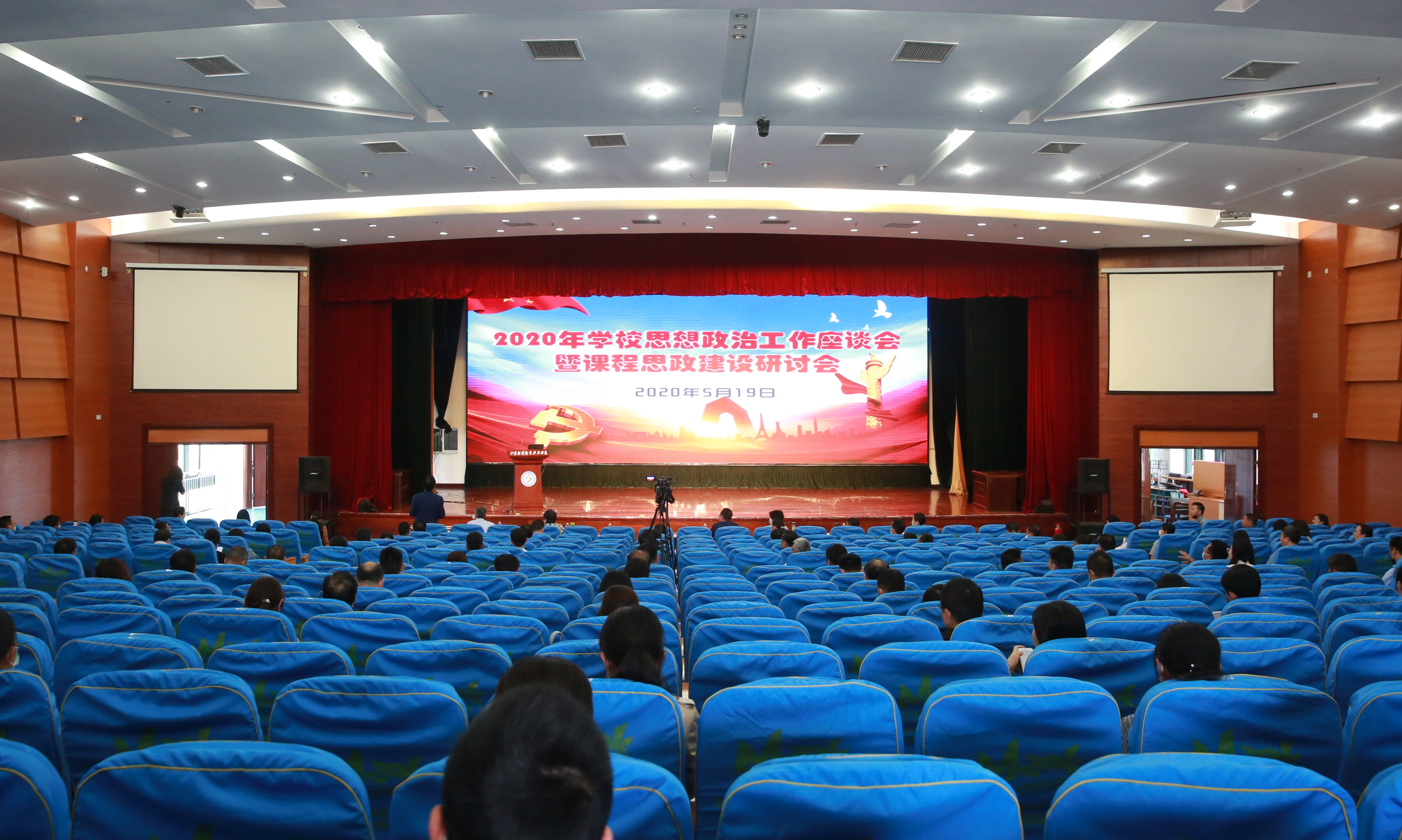 5月19日下午,学校召开2020年思想政治工作座谈会暨课程思政建设研讨会。会议旨在认真贯彻落实全国教育大会和学校思想政治理论课教师座谈会精神,落实落细立德树人根本任务,同心同向全力构建“三全育人”格局。研讨会由校长程淮中主持。全体校领导,全体中层正职,各党总支(直属党支部)委员、党支部书记,各党委工作部门及团委、马克思主义学院全体人员,全体辅导员在图书多功能报告厅主会场参加会议。各二级学院(部)全体专兼职教师在二级学院(部)会议室分会场参加会议。
