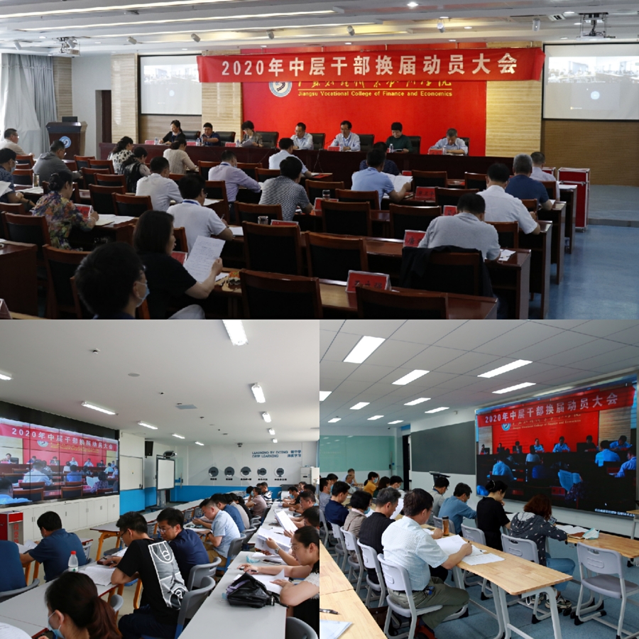 6月24日下午,江苏财经职业技术学院2020年中层干部换届动员大会召开。大会分设一个主会场和两个分会场。全体校领导、中层正职和主持工作的中层副职领导干部在图书馆第一会议室主会场参会,全体中层副职领导干部在两个智慧教室分会场参会。党委书记韩香云做换届动员讲话。校长程淮中主持会议,并就学校机构设置调整情况作相关说明。纪委书记王传荣同志宣读换届纪律“九严禁、十不准”。