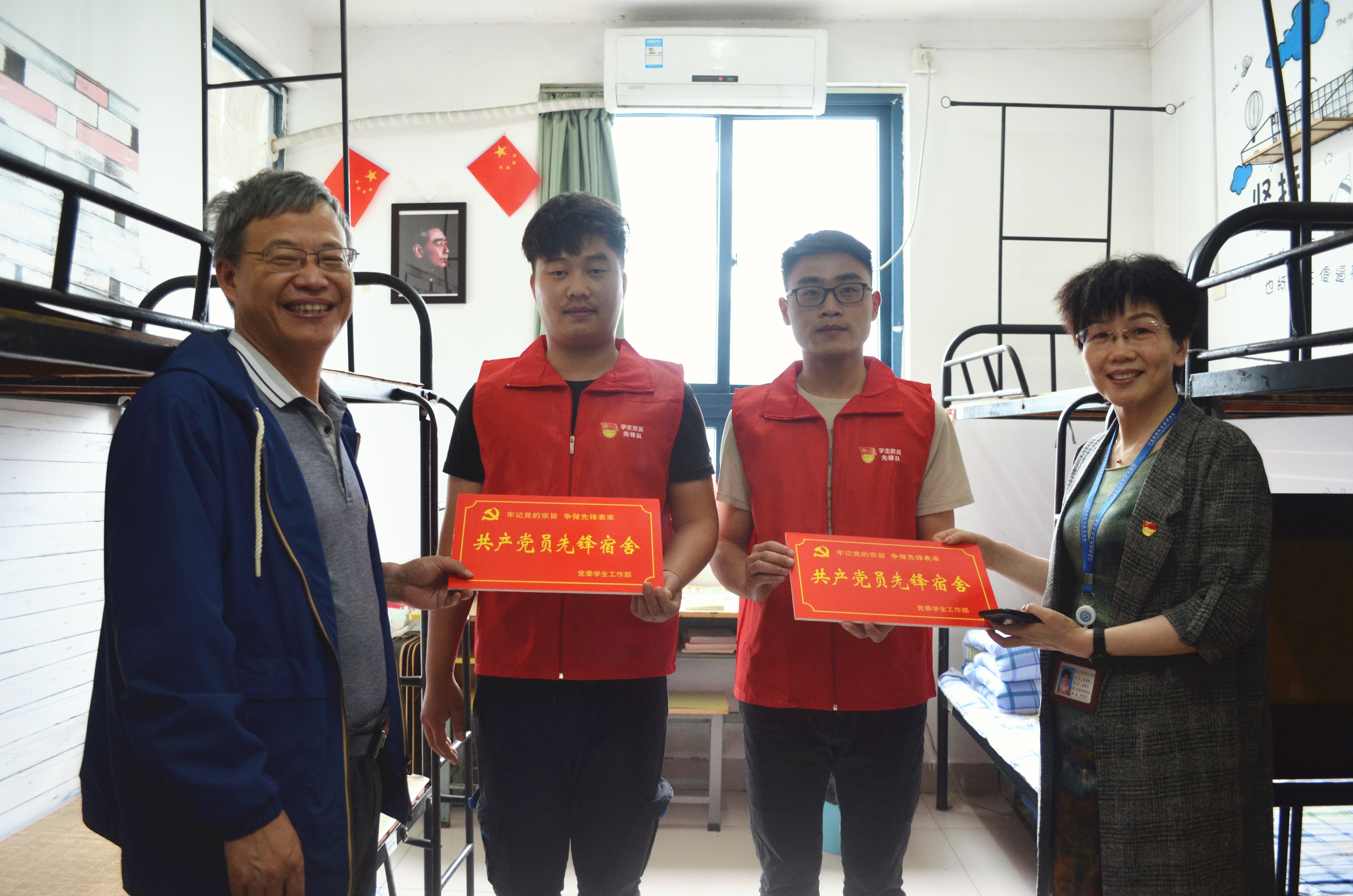 学习交流会结束后,全体人员观摩了学生党员先锋队成员的宿舍,嵇芹珍和梁枫为“共产党员先锋宿舍”授牌。活动还专门邀请了宿舍“好阿姨”李宝珠。李阿姨是我校一名普通的公寓管理员,她兢兢业业,把学校的学生当成自己的孩子,用实际行动践行了一名共产党员的可贵品质。她希望学生党员随时随地都要发扬先锋模范作用,为建设文明宿舍贡献自己的力量。