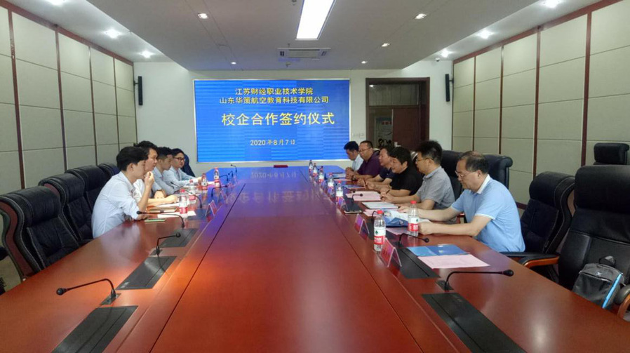 2020年8月7日下午2时,山东华策航空教育科技有限公司总经理郭然、教务主管杨健一行四人抵达江苏财经职业技术学院,受到了副校长杜萍、物流与交通旅游学院周爱群院长的热情接待。双方在校图书馆第二会议室举行了校企合作签约仪式。