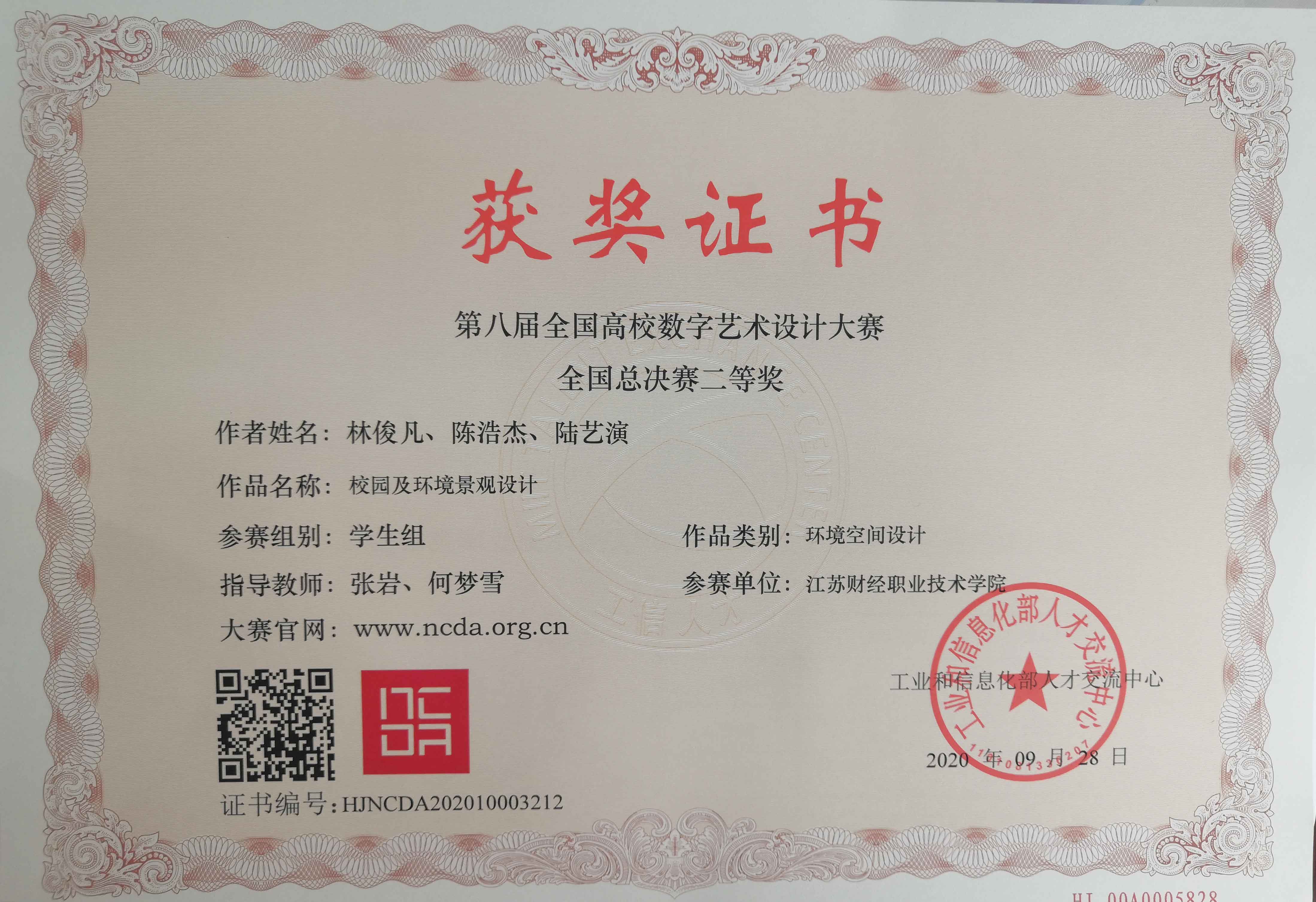 第八届全国高校数字艺术设计大赛国赛评审工作已全部结束,我院由张岩、何梦雪老师指导的18视觉专业学生林俊凡等三人合作作品“校园及景观设计”荣获华东赛区一等奖、全国总决赛二等奖。