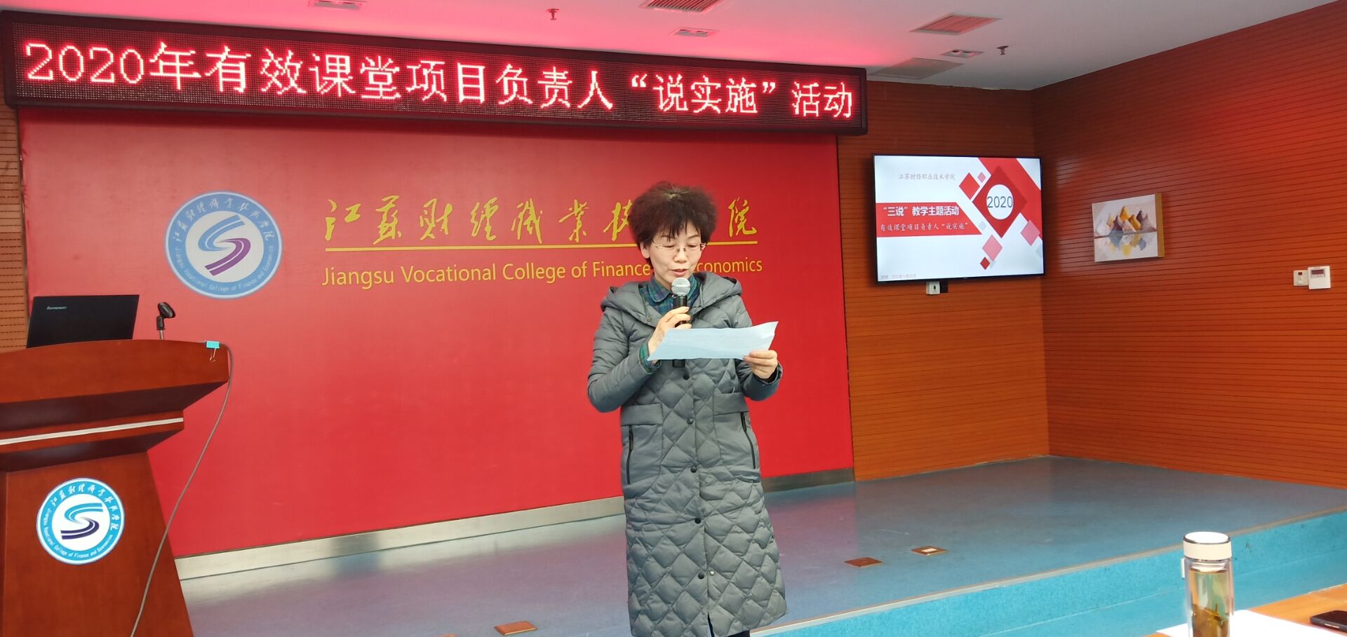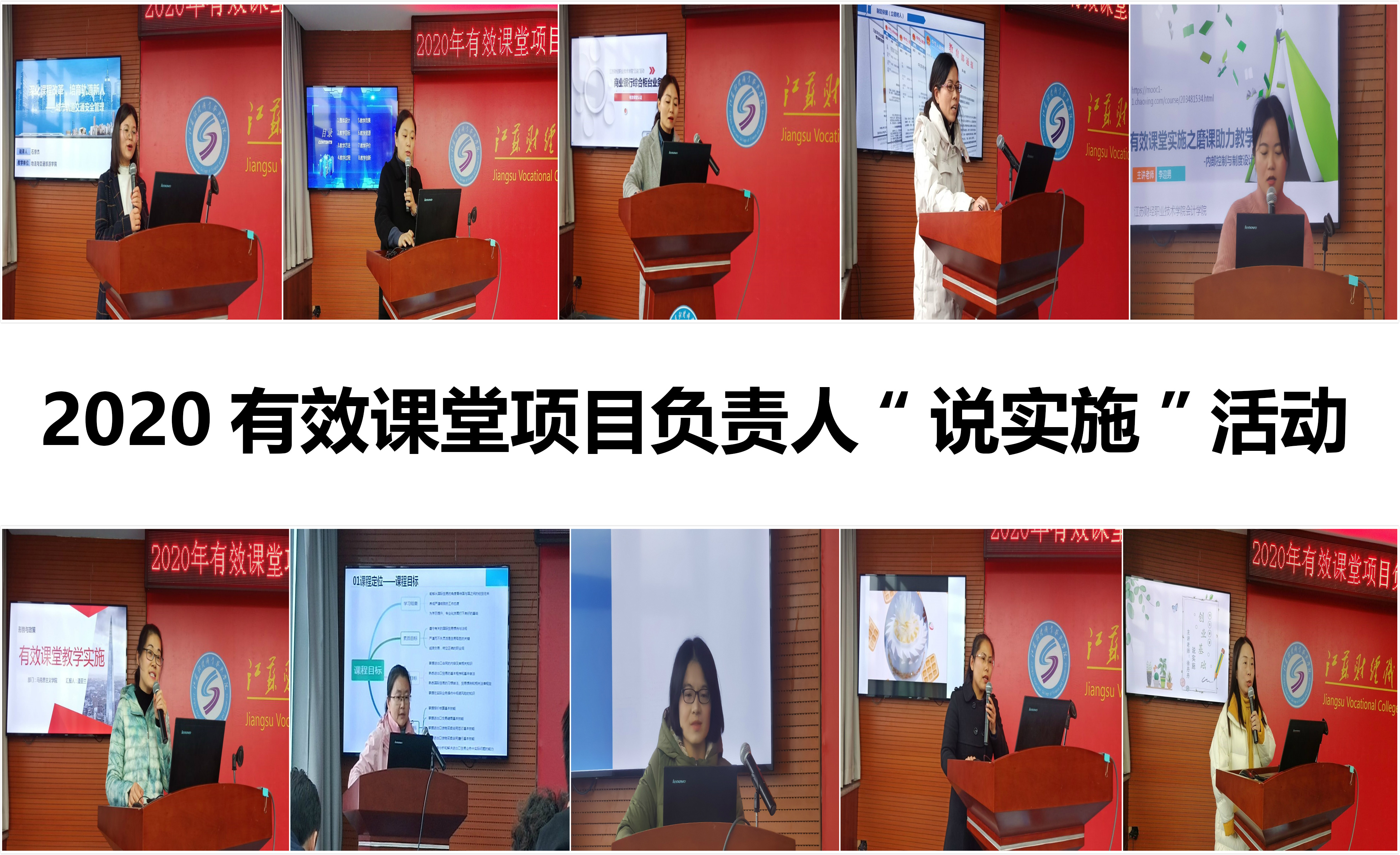 为深入贯彻《国家职业教育改革实施方案》及学校《关于进一步深化人才培养体系改革的实施意见》等文件精神,深化专业内涵建设,推进课堂教学创新,有效提高人才培养质量,11月25日下午,在图书馆200人会议室,我校举办2020年“三说”教学主题——有效课堂项目负责人“说实施”活动。学校党委书记韩香云、副书记嵇芹珍、副校长杜萍,相关职能部门、二级院部(中心)负责人、教研室主任、教师代表、学生代表等共约160人参加了本次活动。教务处副处长、教师发展中心副主任郁士宽主持了本次活动。他现场宣读了汇报顺序,对有效课堂项目负责人“说实施”评分规则和计分事项进行说明。随后,《国际贸易基础》课程负责人李洁、《计算机图像技术》课程负责人徐连霞、《大学语文》课程负责人王茜等十名由二级院(部)推荐的选手依次进行 “说实施”汇报。选手们依据有效课堂认证系列标准和要求,从整体设计、教学目标、教学方法、教学过程、教学效果、教学资源的完整性与多样性及先进性、教学资源的运用等方面进行阐述,充分展示出我校教师扎实的课程改革水平和良好的精神风貌。